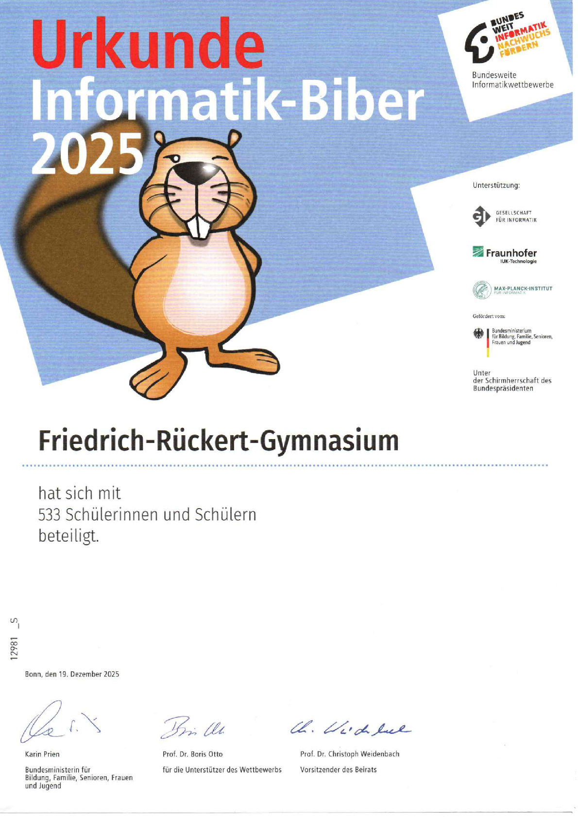 Auch im letzten Jahr hat das FRG wieder am Informatik Biber Wettbewerb teilgenommen. Mit 533 teilnehmenden Schülerinnen und Schülern waren wir sogar die Schule mit dem Teilnehmerrekord in Düsseldorf. 25 Schüler haben sogar einen 1. oder 2. Rang erreicht und einen Sachpreis gewonnen. Jeder Teilnehmer hat darüber hinaus eine Urkunde bekommen. Wir gratulieren allen Teilnehmern und Preisträgern!