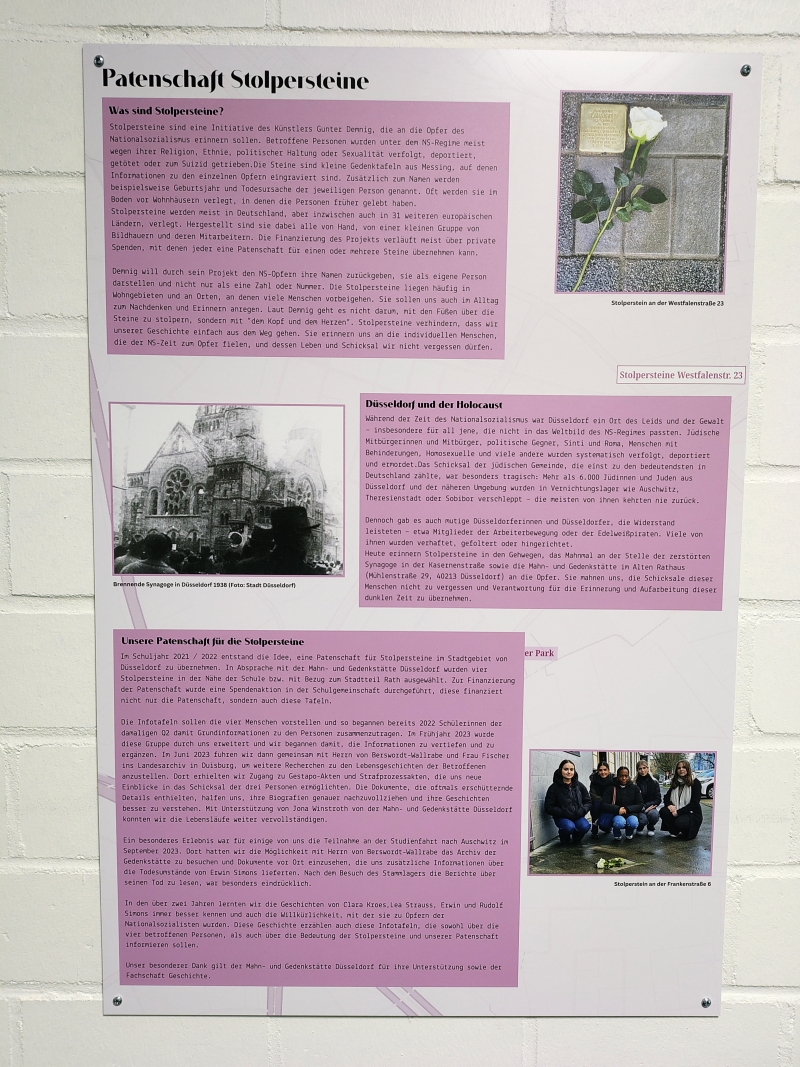 "Es ist schön zu sehen, dass die Arbeit der (mittlerweile ehemaligen) Schülerinnen nun sichtbar ist und die Infotafeln hängen – ein Ergebnis von drei Jahren Engagement und Recherche, das die Erinnerung an die Opfer lebendig hält." sagt Herr von Berswordt-Wallrabe, der das Projekt betreut hat.